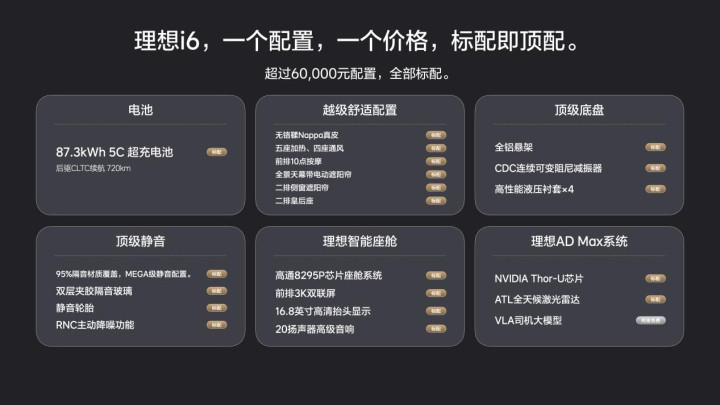 关于理想i6的产品点,“主持人”李想让各个部门的负责人亲自上阵,从产品负责人到智能驾驶的负责人,每个人都以不一样的视频展示的方式,向大家详细的介绍了理想i6的各个部分,少不了一顿猛夸,毕竟是向大家介绍自家的孩子。从新增的颜色,到外观设计,从可变的超大空间,到5C充电、超远的续航、理想i6标配的各种功能,下面这张图片就包含了所有你在这个价位能想到的几乎所有的越级配置。但我认为,这场发布会的重点不在这儿,而是李想带着产品线负责人李昕旸一起亲身为大家近距离讲解理想i6的时候。